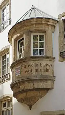 Elle s'exprime en luxembourgeois[24] : "Mir wëlle bleiwe wat mir sin(n)" et signifie en français : "Nous voulons rester ce que nous sommes". Cette devise est extraite du chant patriotique De Feierwon (Le Char de feu) du poète Michel Lentz qui l'a composé à l’occasion de l'inauguration de la ligne de chemin de fer de Luxembourg à Bettembourg-frontière, la toute première du pays, en 1859. Il est devenu un véritable chant national.