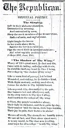 Malgré l’écriture prolifique d’Emily Dickinson, moins d’une douzaine de ses poèmes furent publiés de son vivant. Entre 1858 et 1868, quelques poèmes sont imprimés dans le Springfield Republican de Samuel Bowles. Ils sont publiés anonymement et fortement altérés, notamment avec une ponctuation plus conventionnelle et des titres formels[110]. Le premier poème, Personne ne connaît la petite rose, a probablement été publié sans la permission d’Emily[111]. Le Republican diffuse Un étroit Personnage dans l’Herbe sous le titre Le Serpent, En sécurité dans leurs chambres d’albâtre sous le titre Le Sommeil et Flamboyant d’or et apaisé de violet sous le titre Coucher de soleil[112],[113]. Le poème J’ai goûté une liqueur jamais distillée est un des exemples de version modifiée ; les deux dernières lignes de la première strophe ont été complètement réécrites pour correspondre aux rimes conventionnelles