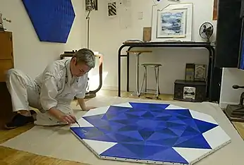 Après le blanc, l’artiste revient depuis 2011 au bleu et au noir pour explorer la troisième dimension, le grand format, le format octogonal (dans le souvenir de la rosace des cathédrales) ou le format hexagonal (qui s’inspire entre autres de jeux d’esprit ou de jeux de hasard comme la pièce d’échecs du Bauhaus, le Rubik’s Cube ou le dé)…