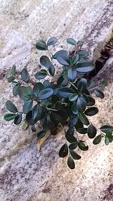 Les feuilles sont petites (5 cm de long) et de forme bien arrondie. Elles sont de couleur vert foncé et sont vernissées sur le dessus. Elles sont épaisses et dures. Leur position sur les branches n’est pas symétrique, ce qui donne un aspect touffu à la plante[3].