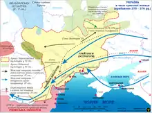 Avancée des Huns en Europe de l'Est (flèches bleues) culbutant les royaumes des Ostrogoths et Wisigoths (en jaune) au IVe s.
