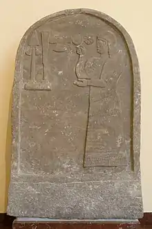 Stèle de Bel-Harran-beli-usur, représenté dans la pose des rois assyriens, mais sans barbe (indication de sa condition d'eunuque) ni couvre-chef, devant des symboles divins, commémorant la fondation de la ville à son nom, Dur-Bel-Harran-beli-usur, mise au jour à Tell Abda[53]. Musée archéologique d'Istanbul.