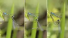 Les œufs donnent naissance à des nymphes (larves) qui vivent dans l'eau en se nourrissant d'animaux aquatiques. Pour devenir adulte (imago), les nymphes sortent de l'eau, s'accrochent à une brindille avant de se transformer en nouvelle demoiselle[1].