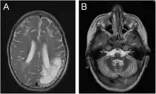 Encéphalomalacie chez un garçon de 7 ans : en imagerie par résonance magnétique (àa gauche) et en tomodensitométrie (à droite)