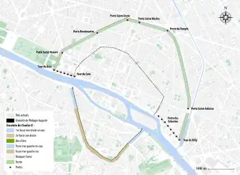L'enceinte de Charles V, construite de 1356 à 1383, est une des sept grandes enceintes ayant chronologiquement entouré Paris[1]. Elle remplace sur la rive droite celle de Philippe Auguste[2]. Sa partie occidentale, devenue inutile après la construction de l'enceinte de Louis XIII, est démolie vers 1640[3]. Sa partie orientale, renforcée par la création de bastions au milieu du XVIe siècle, est détruite à partir de 1670, laissant la place aux Grands Boulevards. Ce rempart dont il demeure peu de vestiges a laissé une forte empreinte sur le plan de la ville.