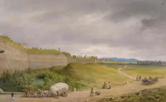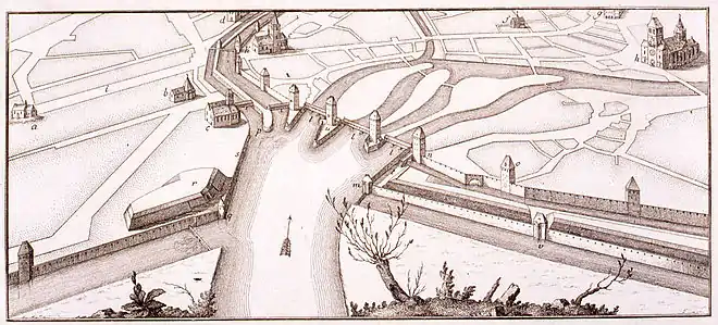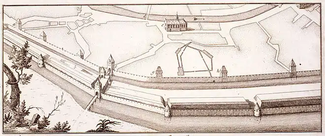 Vue sur les fortifications strasbourgeoises à la sortie de l'İll.