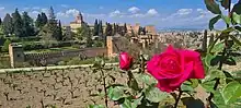 L'Alhambra est fortifiée de murailles d'enceinte comportant de nombreuses tours pour surveiller les alentours. Tous les palais du monument, à l'exception du Généralife, figurent dans cette enceinte.