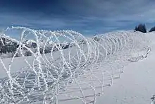 Barrière triple de fils de fer barbelé concertina.