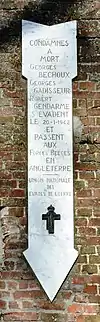 - Raymond Lépouse : agent des Intercommunaux liégeois, membre de l'Armée secrète, arrêté le , se jette par une fenêtre du deuxième étage du Palais des princes-évêques, les mains liées dans le dos, pour ne pas révéler les noms de ses compagnons, meurt le lendemain à l'hôpital Saint-Laurent. Corps transféré ?[précision nécessaire]. Le , un mémorial est inauguré rue Sainte-Ursule — actuellement espace Tivoli — à l'endroit exact de sa chute. Malheureusement, la plaque en bronze du mémorial est volée en par un ou des inconnus[4]. Une nouvelle plaque est replacée le ;