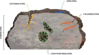 Des endolithes ont été découvertes en milieu terrestre et marin, des pôles aux montagnes en passant par les déserts, et jusqu'à 3 kilomètres de profondeur, et il pourrait en exister plus profondément[8],[9]. Là, la pression due à la profondeur et l'exposition à des métalloïdes et métaux lourds toxiques et à des conditions acides semble être une menace moins importante que l'augmentation de la température. Mais on connait des organismes hyperthermophiles encore capables de se reproduire à environ 120 °C (souche 121). Si c'est une limite absolue, il ne devrait plus y avoir de vie bactérienne à partir de 4-4,5 km sous la croûte continentale et à 7 ou 7,5 km sous le plancher océanique.