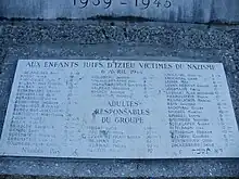 - (en) A group portrait of Jewish children who were hidden in a children's home in the village during the war. The children and staff were caught by the Gestapo in April 1944 and deported to Auschwitz. Izieu, France, summer 1943. Yad Vashem.