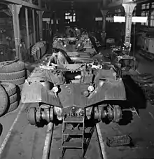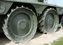 Les pneus montés sur les roues externes pèsent chacun 150 kg, ils sont composés d'une enveloppe interne Michelin Metallic F24 avec un boudin increvable interne Weil Picard en caoutchouc alvéolé, les alvéoles étant remplis d'un gaz neutre sous pression : l'azote[15]. Si un alvéole est percé, les autres se dilatent afin d'occuper l'espace de celui endommagé, permettant ainsi de maintenir une cohérence de l'ensemble. Des freins à tambour sur chaque moyeu assurent le freinage. Chaque roue « agricole » comprend un flasque, en alpax moulé, fixé au moyeu par 80 boulons. Sur ce flasque vient se fixer la jante en duralumin, des silentblocs en caoutchouc spécial, permettant un déplacement latéral de cette dernière de 3 cm tout en insonorisant la roue. La jante est garnie de crampons en acier de forme spéciale pour éviter le bourrage. Son orientation est inverse pour deux roues du même côté, d'où deux types de roues « agricoles » : l'une avant gauche - arrière droit, l'autre avant droit, arrière gauche.