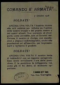 En janvier 1918, il est nommé membre suppléant du Conseil de l'ordre militaire de la Savoie et commande ensuite l'artillerie qui combat sur le plateau d'Asiago puis sur la rivière Piave à partir de juin de la même année. À la tête, obtenue pour mérites de guerre, de la VIIIe armée, il joue un rôle fondamental dans la bataille décisive de Vittorio Veneto.
