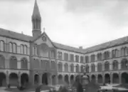 Par son architecture et sa configuration, le bâtiment tout entier doit prendre part à la formation des jeunes recrues[17] : un vaste cloître en fournit le centre, poussant le regard vers le ciel. L'arc en plein cintre et trilobé en constitue son seul décor. Dans un XIXe siècle passionné de Moyen-Âge, le style néo-gothique de la chapelle, qui ouvre sa large et unique nef dans l’aile occidentale du cloître, est allié au style néo-roman dudit cloître. Les voûtes à croisées d’ogives du lieu de culte n’en sont pas moins trapues, ne contrastant donc pas avec les arcs en plein cintre du reste de l’édifice. La parure de vitraux (1926-1928) raconte ici les hauts-faits du saint patron des lieux[18]. Une statue de ce même saint Louis de Gonzague campait, à l’origine, au centre du cloître.