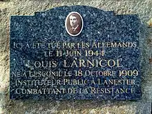 - Dans la nuit du 10 au 11 juin 1944, Louis Larnicol de Plobannalec, instituteur fut massacré par les Allemands : il aurait voulu se rebeller contre ses geôliers. Son corps ne fut jamais retrouvé. Site web de la commune de Plomeur