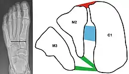Le milieu du pied se compose des cinq os qui forment les arcades du pied (le cuboïde, le naviculaire et les trois os cunéiformes) et de leurs articulations avec la base des cinq métatarses. Ces articulations sont endommagées dans l'entorse de Lisfranc. De telles blessures impliquent généralement les ligaments entre l'os cunéiforme médial et les bases des deuxième et troisième métatarses[5].