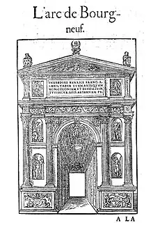 Outre les décorations placées le long des rues et les amphithéâtres dressés sur les places, quelques lieux de passage importants étaient également mis en valeur. C'est le cas de la porte du Pont du Rhône, qui fut transformée en arc de triomphe éphémère monumental[54]. Une gravure nous permet d'en connaître l'aspect. Cet arc de triomphe, décrit comme mesurant 60 pieds de hauteur et 30 pieds de largeur, comporte trois niveaux. En partie basse se trouve le corps de l'arc, agrémenté par deux paires de colonnes dont les socles sont ornés de bas-reliefs et dont les chapiteaux sont formés par des feuillages de chêne. De part et d'autre des colonnes se trouvent trois médaillons portant les portraits de personnages religieux issus de la ville de Lyon. Entre les colonnes, au-dessus de l'arc se trouvent trois autres médaillons entre lesquels est entrelacé un rouleau sur lequel est inscrit "Lugdunum prima sedes galliarum". Sur la corniche soutenue par les colonnes sont présentes quatre fleurs de lys.