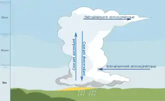 Si l'entraînement se produit en altitude, il aura tendance à assécher le courant ascendant et limitera la hauteur des sommets[3]. L'image ci-contre montre ainsi qu'un taux d'entraînement de seulement 10 % diminue grandement l'extension verticale du nuage. Comme l'air sec est plus dense, il subira également une poussée d'Archimède négative et aura tendance à descendre vers le sol où il pourra donner des rafales descendantes.