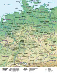 On distingue en Allemagne plusieurs grands espaces : la grande plaine du Nord, les montagnes moyennes du centre, le plateau bavarois et la vallée du Danube au sud. L'altitude maximale est de 2 963 m. 30 % du territoire allemand est couvert par la forêt (feuillus ou conifères)[3]. Les landes et les tourbières occupent une partie du nord du pays.