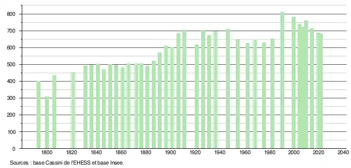 L'évolution du nombre d'habitants est connue à travers les recensements de la population effectués dans la commune depuis 1793. Pour les communes de moins de 10 000 habitants, une enquête de recensement portant sur toute la population est réalisée tous les cinq ans, les populations légales des années intermédiaires étant quant à elles estimées par interpolation ou extrapolation[28]. Pour la commune, le premier recensement exhaustif entrant dans le cadre du nouveau dispositif a été réalisé en 2004[29].