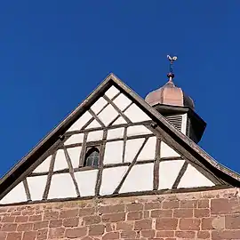 Le plan de l'église est rectangulaire avec une porte latérale avec un petit clocher dominant la toiture[42]. La façade renferme un chœur gothique carré et possède une structure en colombage. La tribune de l'église est portée par une poutre datant de 1667[43].
