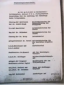 « [14] En référence à ma lettre du 18 octobre 1941, notez s'il vous plaît que l'Oberdienstleiter Brack de la chancellerie du Führer, est disposé à prêter son assistance à la construction du local et des équipements de gazage nécessaires. Pour le moment, nous ne disposons pas d'une quantité suffisante d'équipements, il faut donc d'abord les fabriquer. Puisque, selon Brack, la fabrication de ces équipements dans le Reich occasionne des difficultés beaucoup plus importantes que s'ils étaient fabriqués sur place, il semble pour lui que la meilleure solution soit d'envoyer ses hommes dès maintenant à Riga, en particulier son chimiste, le Dr Kallmeyer, qui se chargera de tout le reste sur place. L'Oberdienstleiter Brack fait remarquer que le procédé en question n'est pas sans danger, de sorte qu'il faut prendre des précautions particulières. Dans ces circonstances, je vous demande de contacter l'Oberdienstleiter Brack à la chancellerie du Führer par l'intermédiaire de votre chef des SS et de la police et de lui demander qu'il vous envoie le chimiste Dr Kallmeyer ainsi que toute l'assistance nécessaire. Je me permets d'ajouter que le Sturmbannführer Eichmann, le responsable des questions juives à l'Office Central de Sécurité du Reich, est absolument d'accord avec cette procédure. Selon des informations qui nous ont été données par le Sturmbannführer Eichmann, des camps pour les juifs seront établis à Riga et à Minsk où les juifs de l'Altreich pourraient être également envoyés. Des juifs sont actuellement évacués de l'Altreich vers Litzmannstadt et vers d'autres camps, à partir desquels ceux qui sont déclarés aptes au travail seront affectés à des unités de travail à l'Est. Les choses étant ce qu'elles sont, il ne saurait y avoir de scrupules concernant le fait que les Juifs qui sont inaptes au travail doivent être supprimés en utilisant la méthode de Brack.