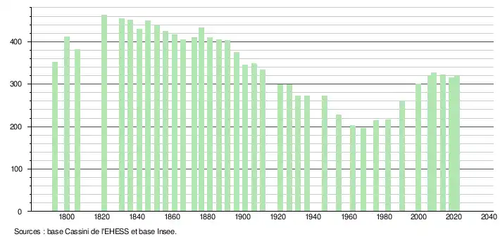 L'évolution du nombre d'habitants est connue à travers les recensements de la population effectués dans la commune depuis 1793. Pour les communes de moins de 10 000 habitants, une enquête de recensement portant sur toute la population est réalisée tous les cinq ans, les populations légales des années intermédiaires étant quant à elles estimées par interpolation ou extrapolation[25]. Pour la commune, le premier recensement exhaustif entrant dans le cadre du nouveau dispositif a été réalisé en 2008[26].
