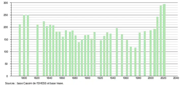 L'évolution du nombre d'habitants est connue à travers les recensements de la population effectués dans la commune depuis 1793. Pour les communes de moins de 10 000 habitants, une enquête de recensement portant sur toute la population est réalisée tous les cinq ans, les populations légales des années intermédiaires étant quant à elles estimées par interpolation ou extrapolation[20]. Pour la commune, le premier recensement exhaustif entrant dans le cadre du nouveau dispositif a été réalisé en 2005[21].