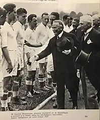 M. Gaston Doumergue, 1er président de la République, saluant les footballeur de l'OM. M Ernest Clere, capitaine de l'OM, ne second plan. 1927.