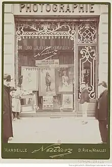- Félix Nadar, « Vitrine de l'atelier de Nadar au 21, rue de Noailles à Marseille », 1 photogr. pos. montée sur carton ; 21,8 x 16,3 cm, sur Gallica (consulté le )