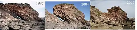 Du point de vue du pourcentage des plages stables, dégraissant ou engraissant[24], le phénomène semble stable depuis 20 ans sur tout le littoral métropolitain, mais l'ampleur des reculs et avancées semble augmenter[25]. Ainsi, en Aquitaine, le trait de côte a reculé sur plusieurs zones de 10 mètres ou plus, en raison des vents et d'une houle inhabituellement forte, fin 2013-début 2014. Du au , la hauteur de houle a atteint ou dépassé 4 mètres, 60 % du temps, c'était « un phénomène qui ne s'est jamais produit » en Aquitaine, selon les spécialistes. Le Conservatoire du littoral et des rivages lacustres a ainsi perdu une quantité significative de terrains. Le littoral rocheux de la Côte Basque, de Biarritz à Hendaye, est lui aussi régulièrement l’objet d’effondrements plus ou moins importants depuis le début du XXe siècle au moins[26],[27] : Rocher du Basta à Biarritz, mais aussi Pile d’Assiettes à Saint-Jean-de-Luz et arche de l’un des Deux Jumeaux à Hendaye par exemple. Le rythme de cette érosion à Hendaye paraît plus soutenu depuis le début des années 2000, avec en particulier l’effondrement du Rocher de la Pointe Ste-Anne, en Baie de Loia (entre 2000 et 2006 - voir image ci-dessous) et, le , le spectaculaire éboulement de la corniche entre Socoa (Ciboure) et Hendaye[28], à la hauteur du récif de Belharra ; la route côtière (D912) est menacée à court terme.
