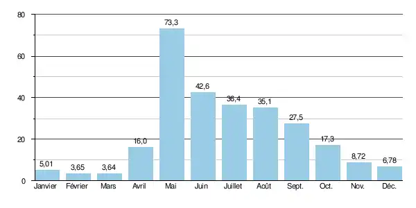 En ne considérant que la période estivale, la plus importante car libre de glaces (de mai à septembre inclus), le débit mensuel minimal observé a été de 14,7 m3/s en , ce qui restait encore assez abondant.