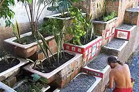 Au pied de l'escalier se trouvent plusieurs baignoires qu'il a transformées en bacs de fleurs. Celles-ci ont été la première étape du travail réalisé pour l'escalier, et le seul réalisé dans ce sens pendant 6 ans ; il les a appelées avec humour, « jardins suspendus »[9].