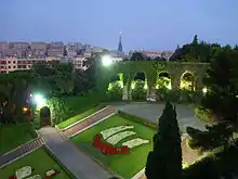 D'une grande ampleur, il se compose de deux rampes distinctes séparées par un parterre de fleurs en pente sur plusieurs étages et cultivées avec de la pelouse. Le parterre est divisé verticalement en trois sections (précédées d'une quatrième, ornée d'ancres stylisées) dans chacune desquelles se détache le dessin qui rappelle symboliquement une à une les trois caravelles utilisées par Christophe Colomb pour son entreprise de découverte de l'Amérique (1492). Les caravelles sont faites avec des décorations florales dans les plates-bandes.