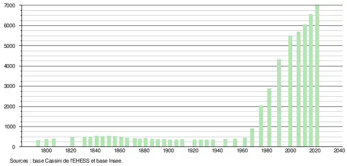 L'évolution du nombre d'habitants est connue à travers les recensements de la population effectués dans la commune depuis 1793. Pour les communes de moins de 10 000 habitants, une enquête de recensement portant sur toute la population est réalisée tous les cinq ans, les populations légales des années intermédiaires étant quant à elles estimées par interpolation ou extrapolation[31]. Pour la commune, le premier recensement exhaustif entrant dans le cadre du nouveau dispositif a été réalisé en 2006[32].