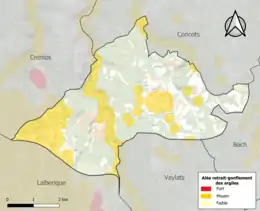 Le retrait-gonflement des sols argileux est susceptible d'engendrer des dommages importants aux bâtiments en cas d’alternance de périodes de sécheresse et de pluie. 27,3 % de la superficie communale est en aléa moyen ou fort (67,7 % au niveau départemental et 48,5 % au niveau national). Sur les 166 bâtiments dénombrés sur la commune en 2019, 75 sont en aléa moyen ou fort, soit 45 %, à comparer aux 72 % au niveau départemental et 54 % au niveau national. Une cartographie de l'exposition du territoire national au retrait gonflement des sols argileux est disponible sur le site du BRGM[27],[Carte 2].