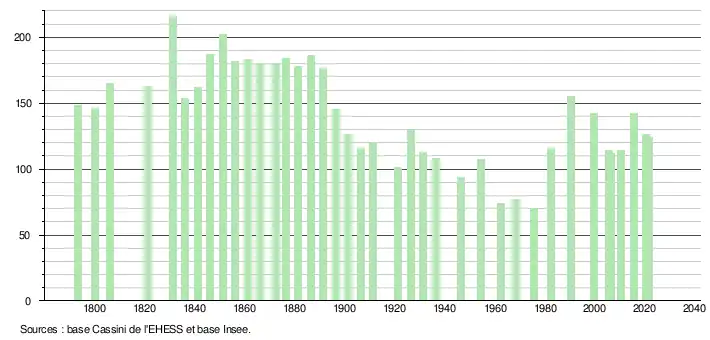 | L'évolution du nombre d'habitants est connue à travers les recensements de la population effectués dans la commune depuis 1793. Pour les communes de moins de 10 000 habitants, une enquête de recensement portant sur toute la population est réalisée tous les cinq ans, les populations légales des années intermédiaires étant quant à elles estimées par interpolation ou extrapolation[39]. Pour la commune, le premier recensement exhaustif entrant dans le cadre du nouveau dispositif a été réalisé en 2005[40]. En 2021, la commune comptait 124 habitants[Note 7], en diminution de 12,68 % par rapport à 2015 (Ariège : +1,38 %, France hors Mayotte : +1,84 %). |