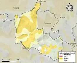 Le retrait-gonflement des sols argileux est susceptible d'engendrer des dommages importants aux bâtiments en cas d’alternance de périodes de sécheresse et de pluie. 47,1 % de la superficie communale est en aléa moyen ou fort (15,8 % au niveau départemental et 48,5 % au niveau national). Sur les 221 bâtiments dénombrés sur la commune en 2019, 113 sont en aléa moyen ou fort, soit 51 %, à comparer aux 14 % au niveau départemental et 54 % au niveau national. Une cartographie de l'exposition du territoire national au retrait gonflement des sols argileux est disponible sur le site du BRGM[26],[Carte 2].