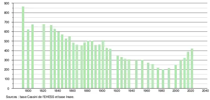 L'évolution du nombre d'habitants est connue à travers les recensements de la population effectués dans la commune depuis 1793. Pour les communes de moins de 10 000 habitants, une enquête de recensement portant sur toute la population est réalisée tous les cinq ans, les populations légales des années intermédiaires étant quant à elles estimées par interpolation ou extrapolation[30]. Pour la commune, le premier recensement exhaustif entrant dans le cadre du nouveau dispositif a été réalisé en 2006[31].