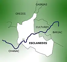 Le principal village de la commune est le Bruel. Il se situe sur la rive nord-ouest du Lot, tout comme le village de la Rocherousse et le château de Marance, tous deux un peu plus haut sur le versant sud de la vallée. De l'autre côté de la rivière se trouvent la ferme du Mazet et le village d'Esclanèdes qui donne son nom à la commune. Enfin, le hameau des Crottes se situe sur le plateau que constitue le causse.