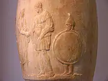 - Une mention chez Homère dans Iliade [détail des éditions] [lire en ligne] (VII, 475), qui se rapporte à des prisonniers de guerre ; le vers est athétisé par Aristarque de Samothrace qui suit Zénodote et Aristophane de Byzance. Kirk, p. 291.