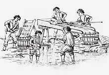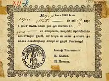 En Valachie, deux mois plus tard, en , une loi similaire fut adoptée par l'Assemblée nationale[74] versant une compensation de 10 galbeni pour chaque rob libéré, échelonnée sur plusieurs années[75]. Les robs émancipés devaient s'installer dans une ville ou un village et y rester pendant au moins deux recensements et ils paieraient leurs impôts au fonds de compensation.