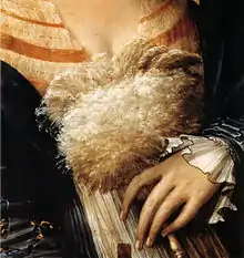 La main de la jeune femme est caractérisée par des doigts minces typiques du Parmigianino ; elle porte à l'annulaire un petit anneau, peut-être une référence à un récent mariage. Elle tient un panache, représenté à l'aide de fins coups de pinceau[1].