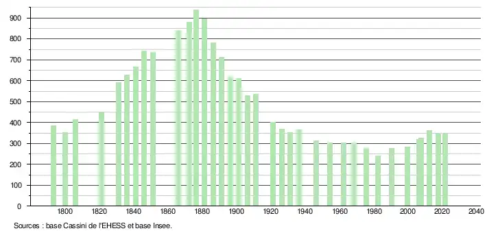 L'évolution du nombre d'habitants est connue à travers les recensements de la population effectués dans la commune depuis 1793. Pour les communes de moins de 10 000 habitants, une enquête de recensement portant sur toute la population est réalisée tous les cinq ans, les populations légales des années intermédiaires étant quant à elles estimées par interpolation ou extrapolation[16]. Pour la commune, le premier recensement exhaustif entrant dans le cadre du nouveau dispositif a été réalisé en 2007[17].