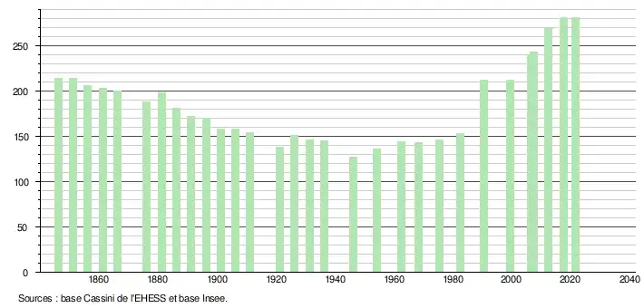 | L'évolution du nombre d'habitants est connue à travers les recensements de la population effectués dans la commune depuis 1846. Pour les communes de moins de 10 000 habitants, une enquête de recensement portant sur toute la population est réalisée tous les cinq ans, les populations légales des années intermédiaires étant quant à elles estimées par interpolation ou extrapolation[29]. Pour la commune, le premier recensement exhaustif entrant dans le cadre du nouveau dispositif a été réalisé en 2007[30]. En 2021, la commune comptait 281 habitants[Note 5], en augmentation de 0,72 % par rapport à 2015 (Hautes-Pyrénées : +1,04 %, France hors Mayotte : +1,84 %). |