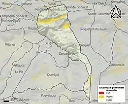 Le retrait-gonflement des sols argileux est susceptible d'engendrer des dommages importants aux bâtiments en cas d’alternance de périodes de sécheresse et de pluie. 8,9 % de la superficie communale est en aléa moyen ou fort (75,2 % au niveau départemental et 48,5 % au niveau national). Sur les 207 bâtiments dénombrés sur la commune en 2019, 3 sont en aléa moyen ou fort, soit 1 %, à comparer aux 94 % au niveau départemental et 54 % au niveau national. Une cartographie de l'exposition du territoire national au retrait gonflement des sols argileux est disponible sur le site du BRGM[34],[Carte 3].