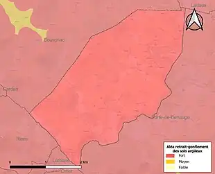 Le retrait-gonflement des sols argileux est susceptible d'engendrer des dommages importants aux bâtiments en cas d’alternance de périodes de sécheresse et de pluie. La totalité de la commune est en aléa moyen ou fort (67,4 % au niveau départemental et 48,5 % au niveau national). Sur les 129 bâtiments dénombrés sur la commune en 2019, 129 sont en aléa moyen ou fort, soit 100 %, à comparer aux 84 % au niveau départemental et 54 % au niveau national. Une cartographie de l'exposition du territoire national au retrait gonflement des sols argileux est disponible sur le site du BRGM[22],[Carte 2].