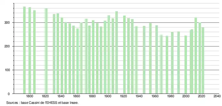 L'évolution du nombre d'habitants est connue à travers les recensements de la population effectués dans la commune depuis 1793. Pour les communes de moins de 10 000 habitants, une enquête de recensement portant sur toute la population est réalisée tous les cinq ans, les populations légales des années intermédiaires étant quant à elles estimées par interpolation ou extrapolation[30]. Pour la commune, le premier recensement exhaustif entrant dans le cadre du nouveau dispositif a été réalisé en 2007[31].