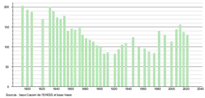 L'évolution du nombre d'habitants est connue à travers les recensements de la population effectués dans la commune depuis 1793. Pour les communes de moins de 10 000 habitants, une enquête de recensement portant sur toute la population est réalisée tous les cinq ans, les populations légales des années intermédiaires étant quant à elles estimées par interpolation ou extrapolation[19]. Pour la commune, le premier recensement exhaustif entrant dans le cadre du nouveau dispositif a été réalisé en 2006[20].