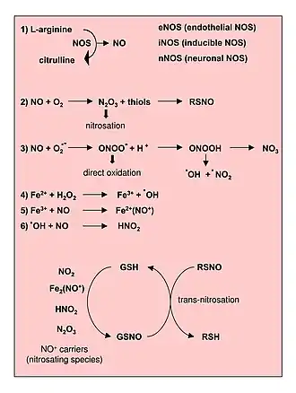 Les espèces réactives de l'azote et de l'oxygène agissent synergiquement[2], notamment via la réaction suivante, en tant que polluants et dans les cellules et l'organisme vivant, selon la réaction :